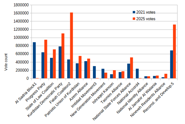 5- إئتالف الإعمار والتنمية لم يكن موجودا في انتخابات 2021 ومجموع الأصوات يمثل ثلاثة من مكوناته وهي تيار الفراتين والعقد الوطني وإئتلاف الوطنية. لم تكن أصوات الأخيرة متوفرة لعام 2025 لذا استعملت أرقام من 2018.