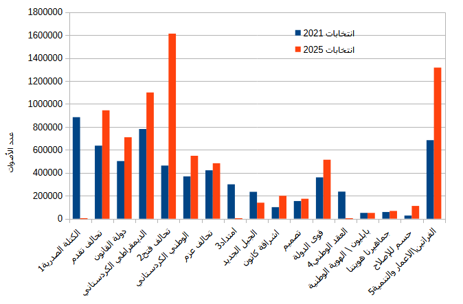 5- The Reconstruction and Development Coalition did not exist in 2021, the total here is for three of its constituents: Al Furatain, the National Accord and Watania Coalition. The popular votes of Watania Coalition were not available as a separate entity for 2021, so partial data from 2018 were used.